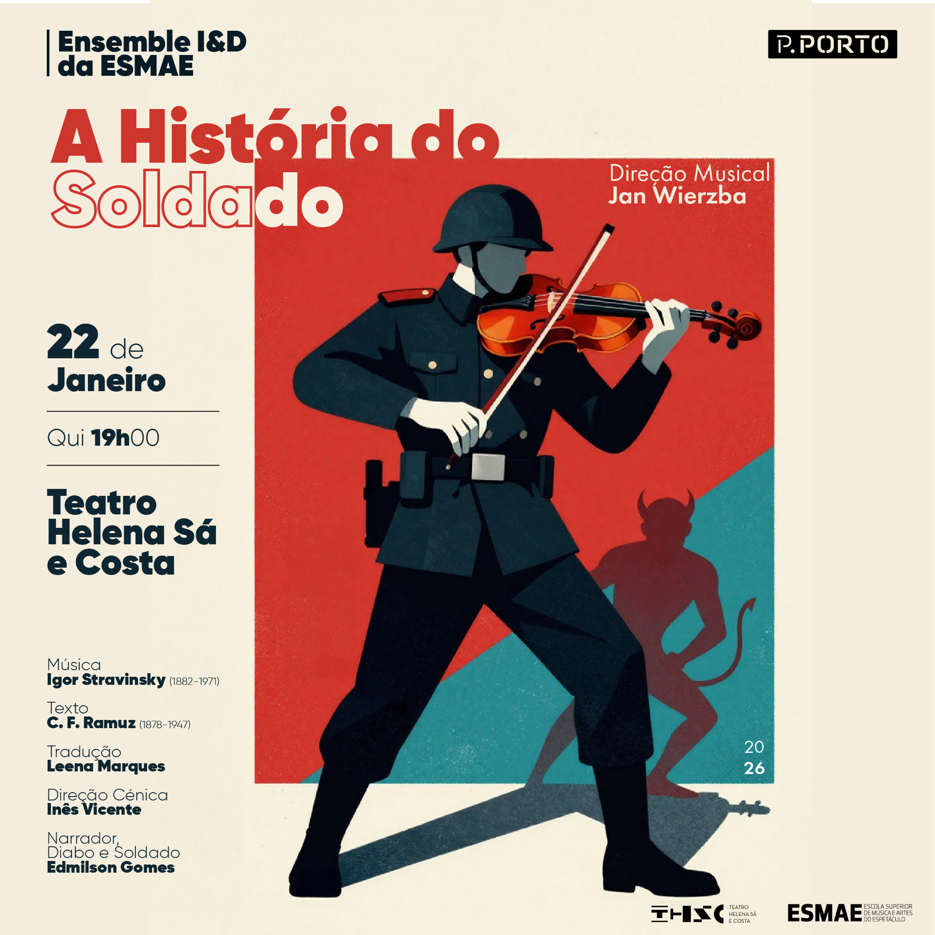 No dia 22 de janeiro, o Teatro Helena Sá e Costa recebe uma das obras mais icónicas do século XX: "A História do Soldado", de Igor Stravinsky e C. F. Ramuz. Apresentada pelo Ensemble I&D da ESMAE, sob direção musical de Jan Wierzba e direção cénica de Inês Vicente, e com Edmilson Gomes a assumir o papel de Narrador, Diabo e Soldado.