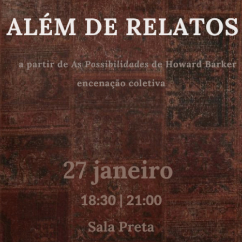 A Sala Preta da ESMAE será palco, no dia 27 de janeiro de 2025, do espetáculo "Além de Relatos", inspirado na obra As Possibilidades, de Howard Barker. Com apresentações marcadas para as 18h30 e as 21h00, esta criação é fruto do trabalho coletivo dos estudantes do 3º ano da Licenciatura em Teatro.