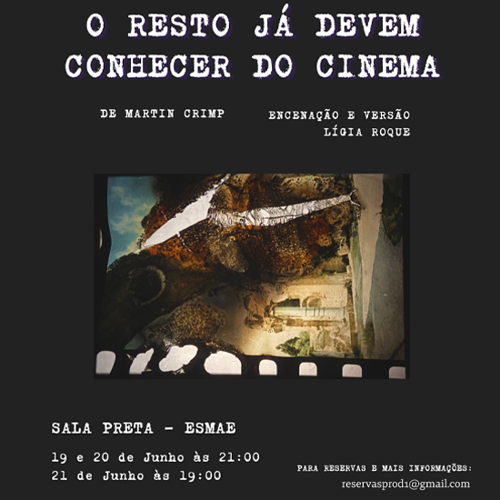 Os alunos do 1º ano da Licenciatura em Teatro da ESMAE apresentam, nos dias 19, 20 e 21 de junho, o espetáculo ‘O Resto Já Devem Conhecer do Cinema’, de Martin Crimp, com encenação e versão de Lígia Roque. As sessões decorrem na Sala Preta da ESMAE, às 21h00 (quinta e sexta-feira) e às 19h00 (sábado).